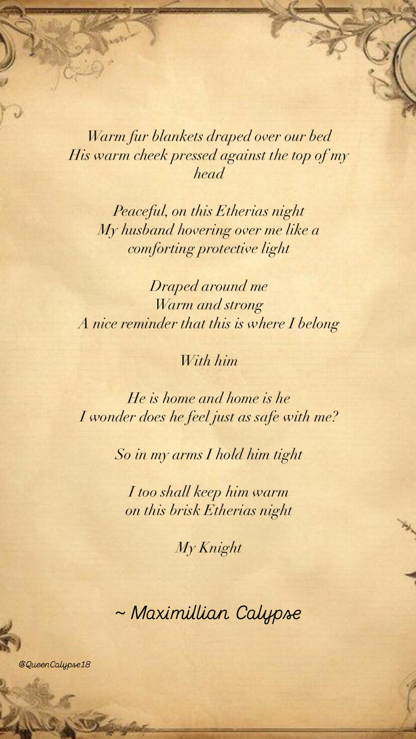 Not taking the warning, Sejour taunted him further. “Oooh did I just make the Big Bad Wolf bark?”A dangerous glint flashed through Riftan’s eyes and he looked like he was about to toss Aren across the room. Sensing danger ahead of himself, Sejour’s eyes went round and he appeared to be both fearful and excited.“Riftan! E-Enough!” Maxi shouted. She reached up and pulled on his arm hard until he released Sejour and pushed him away.The crowd had gone awkwardly silent, countless people had their phones out, ready to record a potential fight. Maxi blushed in embarrassment as she and Riftan both led each other away.“Phew, that was close folks,” Sejour said into the microphone. He chuckled nervously while rubbing his collar bones. “It’s not a party until Riftan Calypse threatens someone over his girl, amirite?” Everyone did find that humorous and laughter traveled amongst the crowd again. Now that Sejour had the crowd back he brought things to a close. “Alright now let’s finish this. The last winner for funniest costume is… Grace Nirtha! Get on up here Grace!”The crowd went back to cheering like nothing had happened. Grace jumped up and down, as equally excited.“Woohoo! That’s my woman!” Hebaron bellowed. He gave Grace a double high five and lightly bumped his belly to hers, then he tried to pick her up on his shoulders, but she was quick to say no.Maxi didn’t pay much attention to what was happening behind her as she shuffled alongside Riftan to a corner of the living room.Even though things were settled down and the crowd was getting back to dancing, Riftan was still shooting daggers at Sejour. Maxi wasn’t much in the mood to dance again, her feet were beginning to hurt from her boots. She figured it might be best to call it a night.“Wh-What do you say we t-take our gift basket back to our room… a-and settle down f-for the night?”She pressed herself against him a little to tempt him. Riftan finally stopped murdering Sejour with his gaze to meet Maxi’s eyes staring up at him.“It’s probably a good idea, you’re looking a little tired.” He brushed her bangs out of her face and tenderly caressed her cheek.Instead of assuring him she still had some energy left, Maxi took his hand and led him towards the stairs. It wasn’t hard to find their room, it was straight down at the end of the hall of the second floor. After going in and closing the door behind himself, Riftan locked the door and Maxi tossed her cape aside then plopped on the bed to take her boots off.Riftan took over and untied the laces to pull off each of her boots, then he started to strip off his costume. Maxi finished taking off her belt and other accessories too, leaving only her dress. She avoided watching Riftan undress too closely, and started opening the gift basket.Inside was a bottle of wine, all kinds of chocolates and snacks, and a few different gift cards for places to eat and one certificate for a couple’s massage. Maxi went for the chocolates first, meanwhile Riftan propped up some pillows behind her so she could lay back. Then he sat on the bed in front of her, wearing only his boxer briefs, and started to rub her sore feet.She was going to insist he didn’t need to, but it felt so good she couldn’t ask him to stop. After only a few minutes her eyelids started to feel heavy. Maxi looked at the time on her phone and it was after one in the morning, which meant Elysia should be back asleep by now after her feeding. She wondered how she was doing.“Will you pull up the babycam, please?” Maxi asked in a drowsy voice.Riftan did as requested and handed over his phone. On the screen Maxi could see Elysia sound asleep in her crib, her pacifier in her mouth and Roy curled up at her feet too. They looked so sweet, it made Maxi miss her more than she already did. Before she made herself sad she handed the phone back to Riftan. He looked at Elyisa on the screen too for a moment and then turned it off.Maxi adjusted against the pillows to get more comfortable, and when she did she noticed she had eaten quite a bit of the chocolates in the tin on her lap, without sharing any with Riftan.“Here, try one.” She leaned forward and popped a chocolate covered blueberry into his mouth. Riftan licked her fingers before she could pull her hand away too fast.“Mmm… that’s good.” As if to prove the delicious taste he licked his lips as well.Seeing him do so made her feel warm and fuzzy inside. She was becoming increasingly tired, but she also had to urge to be with him. After all, this was a rare occasion that there wasn’t an infant around to interrupt them, and who knew when this would happen again. Not to mention it was getting difficult to stare at his well fitted boxer briefs and not feel something.Without warning, she pushed his hands away from massaging her feet, then sat up to kiss him. He indulged her and returned the kiss several times over, before he unexpectedly brought things to a halt.“We shouldn’t,” he said in a thick voice and pulled away.Maxi looked at him confused, unable to figure out why he wanted to stop when he had been sending her signals all night.“We sh-shouldn’t? Not even a little?”“Were you expecting that we would?”“W-Well… yeah… I can’t remember the l-last time we did it without a baby in the next room. I figured you would take advantage of the opportunity, w-with the way you’ve been acting all night,” she explained.Riftan brushed her hair over her shoulder, and then rubbed her bottom lip with his thumb.“As much as you’re looking like a hot mom that I want to eat up from head to toe and from every angle, I know you’re tired,” Riftan whispered against her lips. “Your eyes are only half open... But if you’re concerned with missing our window of opportunity, perhaps I’ll wake you up in the morning to do the monster mash.”Maxi giggled at his choice of words to describe their relations. He pushed her back o